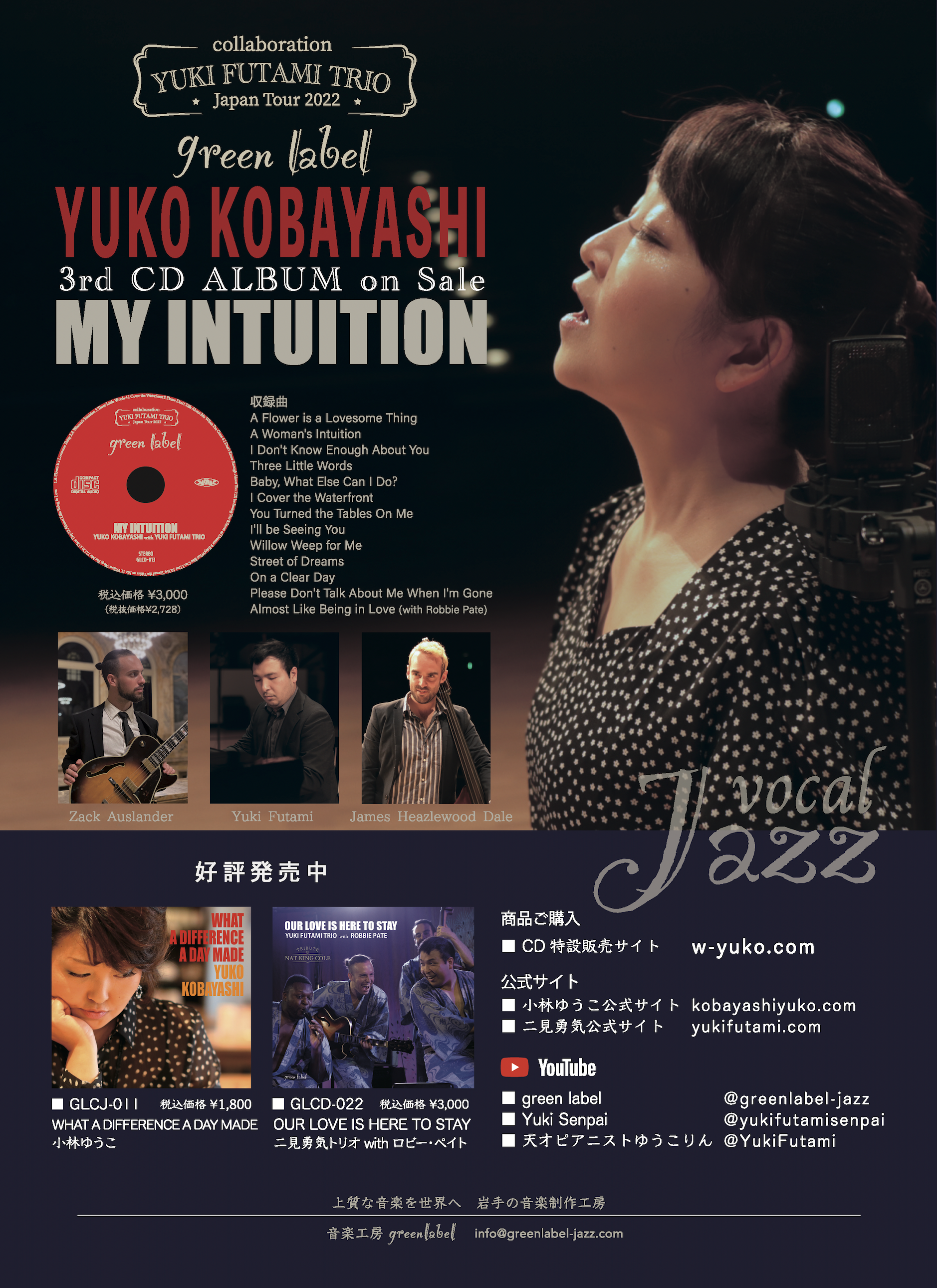 音楽工房 green label レーベルメイトによる特別企画!新着CD情報から、レコーディング制作特典映像まで掲載。小林ゆうこの詳細情報から二見勇気トリオwithロビーペイト"じゃぱんツアー2023"の様子もご覧いただけます。